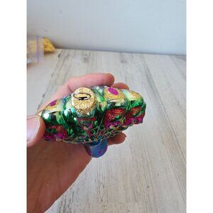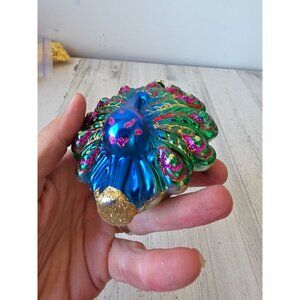 about 4.5 in tall by 3.5 x 2 in, overall in good condition, no significant problems except for little superficial scratches predominantly over one of the feathers
