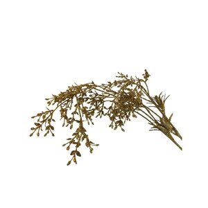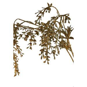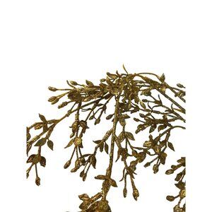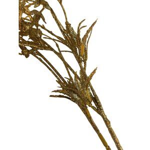 Enhance your holiday decorations or crafting projects with these glittering gold artificial floral branches. Elegantly crafted, each branch features multiple shimmering stems adorned with delicate leaves and buds for a sparkling touch. These versatile branches are lightweight, durable, and suitable for various displays such as centerpieces, garlands, or festive wreaths. Their golden finish provides a luxurious flair, perfect to complement any decor arrangement during celebrations or events. Flexible and easy to shape, these faux branches are a practical yet stylish decor element that adds a festive ambiance to both formal and informal settings. 2 stems, Total length approximately 24 inches. New condition.