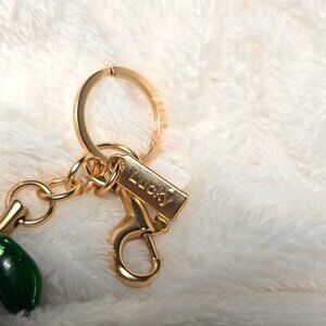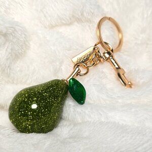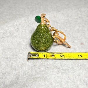 Sparkling green pear keychain with gold accents. Perfect for adding charm to your keys or handbag.