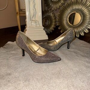 Elegant glittery heels with a gold interior. Perfect for special occasions or casual. Worn only a couple times, in great condition only one flaw refer to photos. Does not come with original box.