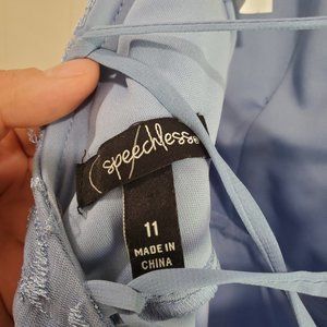 Adorable Cinderella blue mini dress. Embroidery adds extra glitz. Flattering skater dress figure. Worn 1x for a wedding.