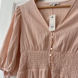 This elegant pink V-neck dress features from Francesca’s a flattering silhouette with puff sleeves and delicate button details. Perfect for any occasion.