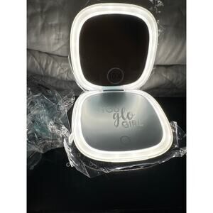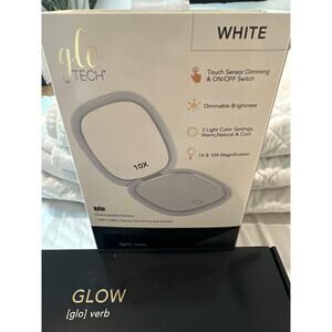 The Glo Tech LED Compact Mirror in white is a sleek and portable beauty essential designed for on-the-go convenience. This compact mirror features bright LED lights that provide clear and even illumination, ensuring perfect makeup application and touch-ups anytime, anywhere. Its slim, lightweight design fits easily into handbags or pockets, making it ideal for travel and everyday use. The Glo Tech LED Compact Mirror combines style and functionality, offering a crystal-clear reflection with the added benefit of adjustable lighting for flawless results in any setting.