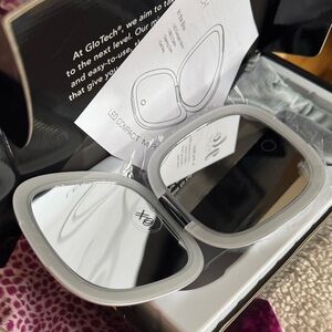 GloTech LED compact mirror in sleek white. Perfect for on-the-go touch-ups. Charger chord included