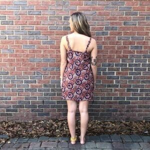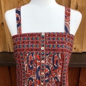 NWT Global Desi sleeveless dress in a vibrant red, blue, and brown boho-inspired print. Lightweight and airy fabric with button-front detail, wide straps, and an easy, relaxed fit. Perfect for warm weather, vacations, or casual everyday wear.
