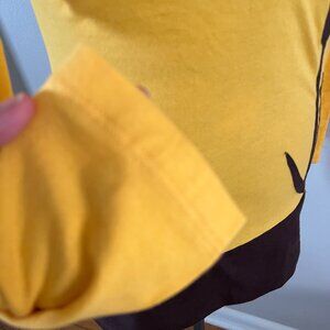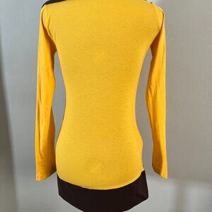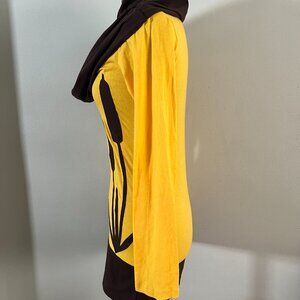 One of a kind, handsewn piece by Global Goddess Goods. Slim, stretchy fit, works for a small medium best. Organic cotton knit with substantial cowl neck that can be folded over, worn like a scarf or worn like a hood. Longer overall length with double layered band at bottom hem.. Sewn cattail motif on one side. Brown and golden yellow. Unique and made in USA. In excellent condition, never worn.