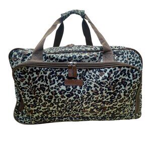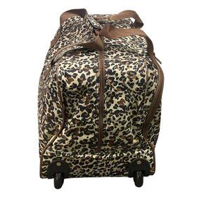 Stylish leopard print rolling duffel with durable handles, retractable pull handle, wheels, and spacious zippered compartments for easy travel organization. Lightweight and functional design.
