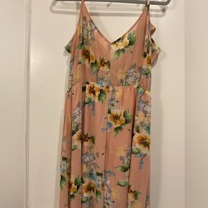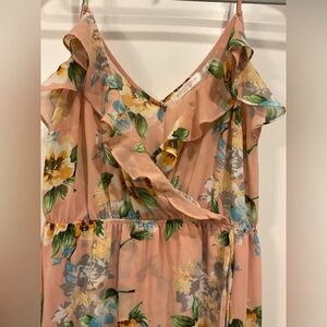 Elegant floral dress with ruffle details. Features a beautiful floral pattern on a peach background.