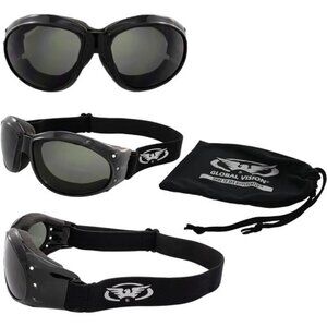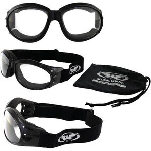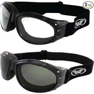 Are you looking for the ideal pair of riding goggles that will complement your style while keeping your eyes safe? The Eliminator Deluxe Anti-Fog Motorcycle Goggles are a great choicefor men or women who like to take their bikes off-road or on the track as they offer superior protection against airborne debris such as dirt, dust, and rocks. You will receive a set of clear lens goggles for night riding and a pair of extremely dark lenses for daytime riding when you purchase our 2-pack. Our 3-pack also includes a set of yellow lenses, which are excellent for riding in the morning, evening, or nighttime. Each pair is enclosed in a black cushioned frame that is so soft you won't even notice the plastic corners of the frame while driving. This pair of RV goggles is perfect for any rider and portrays the classic red baron style. Scratch-resistant coating and shatterproof polycarbonate lenses with a UV400 coating are additional characteristics that provide the most UV protection from the sun's damaging rays. This protective eyewear is sure to keep you safe and stylish no matter where the road takes you.
