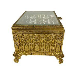 Globe 24kt Gold Plated Jewelry Trinket Box Ornate Filigree Gilt Glamour Vanity