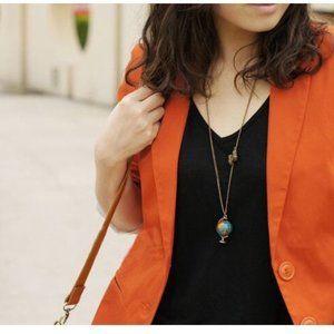A golden necklace chain featuring blue enamel painted globe of earth and cute little golden / brass binoculars.