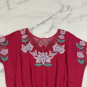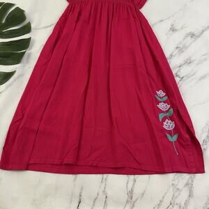 Globe Trotter women's pink and purple embroidered floral sundress, size M. It is free from any rips or stains but the elastic is stretched out. It measures about 42 inches around the bust, about 30 inches around the waist and is about 44 inches long.