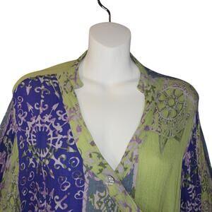 Globe Trotter Womens XL Snap Up Shirt Flowy Pirple Green Artsy Stars Colorful
