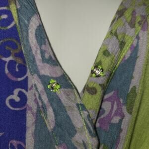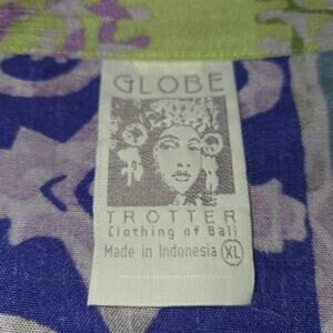 Globe Trotter Womens XL Snap Up Shirt Flowy Pirple Green Artsy Stars Colorful. In good, pre-owned condition with no noted rips, tears or stains. Measurements in description and in pictures with ruler. Please see pictures as they are considered part of the description.