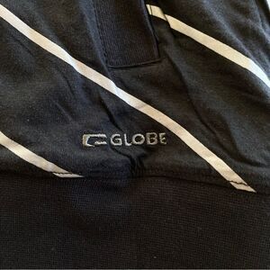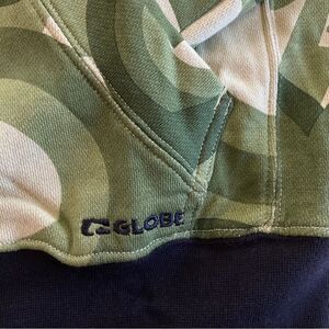Globe Damien Custom Reversible Hooded Zippered Jacket. Really awesome statement piece. One side black with stripes, the other side is a modern camo. Side pockets on both sides. Removable material tag, logos are embroidered on both sides, hoodie zips all the way up to fully closed. Medium weight, it's thicker than a regular hoodie since it has twice the amount of fabric. Breathable fabric, cotton blend. Great for travel, casual wear, or layering. Gender neutral, unisex. Measurements in pictures.