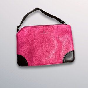 This amenity bag combines practicality with a chic design. Its vibrant pink leather exterior is complemented by black accents and a stylish blue patterned interior. The compact size and durable leather construction make it an ideal choice for carrying essentials in style.