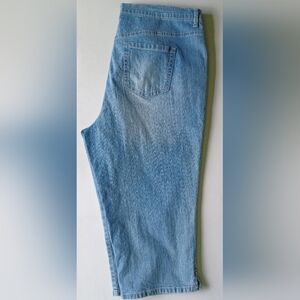 women's high rise light blue denim capri. all around slimming effect. pre-owned. barely worn condition. stud slit decorative side leg hem. see pictures. they are part of the description. measurements are approximate.