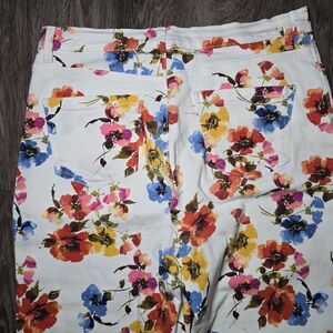 Pre-owned Gloria Vanderbilt womens Amanda Capri jeans in good condition with normal wear. Size 12. Features a white base with a multi-colored floral print and the classic Amanda fit.