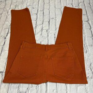 Preloved Gloria Vanderbilt Amanda jeans in a vibrant orange/rust color, women's size 8 Short. These stylish jeans feature a comfortable mid-rise fit and a classic tapered leg, providing a flattering silhouette. Made from a durable blend of 99% cotton and 1% spandex, they offer a touch of stretch for all-day comfort.