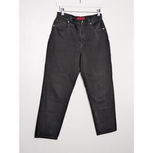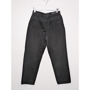 Gloria Vanderbilt Amanda Jeans in size 10, featuring a black denim fabric with stretch for comfort. These straight leg jeans have a high rise and a 26.5-inch inseam. They are designed with a 5-pocket style, belt loops, and a dark wash. The material blend includes spandex and cotton, making them machine washable. Perfect for a casual occasion, these jeans offer a flattering fit and classic style with a touch of 90s nostalgia.