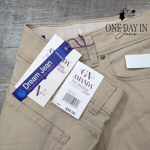 These Amanda jeans are quite a sight, with beige so soft and fitting just right! From Gloria Vanderbilt they came to be, slimming magic for all to see!
