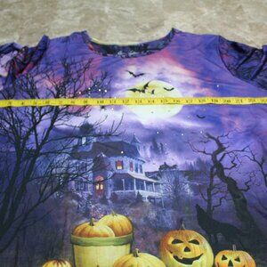 Celebrate the spooky season in style with this Gloria Vanderbilt Casuals women's top featuring a vivid Halloween-themed design. The front showcases a haunted house shrouded in eerie purple and pink skies, a full moon illuminated with flying bats, and a cheerful gathering of jack-o-lantern pumpkins. Sparkling rhinestone accents add a touch of shimmer to the moon and surrounding sky, enhancing the mystical vibe.