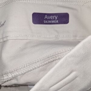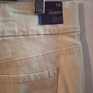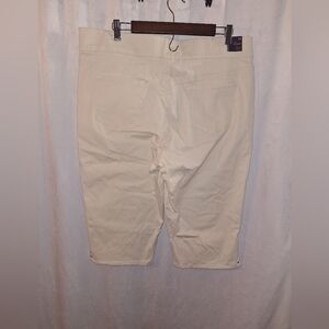 Experience the comfort and style of Gloria Vanderbilt's cream skimmers designed with a relaxed fit for everyday wear. Crafted from a soft cotton blend, these skimmers offer a versatile look that complements any casual occasion. Embrace the timeless appeal of these essential wardrobe staples. side to side measurements is 19" rise is 12," inseam is 17" top of waist to bottom hem is 28" bundle more items for bigger deals Bin-151