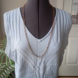 This ice blue sleeveless shell has a knitted in ribbing pattern. This has the look of silk with an easy care fabric.
