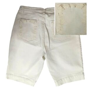 Gloria Vanderbilt Classic Casual Amanda Shorts Embroidered Studded Pockets Taper Bermuda High Rise Mid Wash Stretch Denim Women 10 Ivory White Zip Button Closure Belt Loops Pocket Detail
