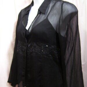 Sexy Blouse Set Rich Black Silky Sheer Gloria Vanderbilt Size M-L Beaded on Lace Accented Waist Over Sheer Camisole Wedding Evening Wear.
