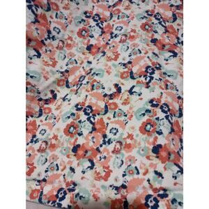 Features an allover floral print in pink, blue, and mint on an off-white background.