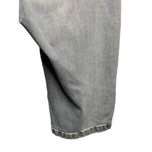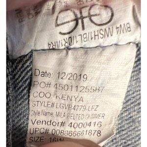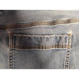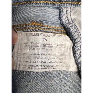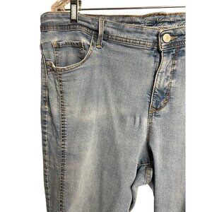 Slimming Gloria Vanderbilt blue skimmer jeans with a stretchy fit in size 16. Features a waist of 19, rise of 11 and an inseam of 16. Made in Kenya and machine washable. Accented with three buttons on the side hem. Small flaw shows where at top of back pockets.
