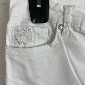 Classic pair of white denim style shorts featuring a stretch fit. The measure 14 inches at the waist laying flat, 25 inches in total length, and have a 14 inch inseam.