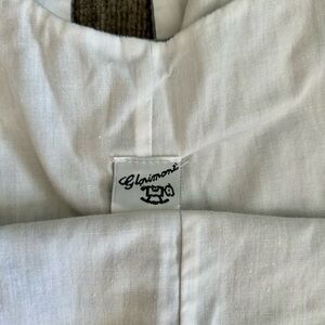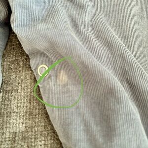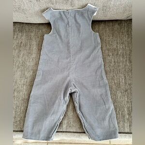 Glorimont gray longall of 100% cotton, fully lined inside and a soft corduroy style on the outside. The pants snap closed and the shoulders have overall straps that close with a button. There are no holes. I noted 2 spots of discoloration that I circled in green in closeup pics.