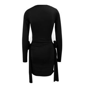 "Your perfect weekend look is here, so stop scrolling and grab this black soft-touch long sleeve bodycon dress with rose detail! Crafted from soft black fabric with long sleeves, a delicate rose design, and flattering ruched details, this dress is a must-have this season. It’s sure to turn heads and keep you on-trend. Pair it with your favorite heels, gold accessories, and a chic mini bag to complete the look."