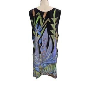 Beautiful one-of-a-kind artist-made "Glory fibers" original designs 100% silk hand painted dress front & back; black with irises and floral art; slits on each side on the bottom. Best look with slim pants or leggings. Perfect like new condition.