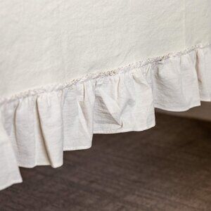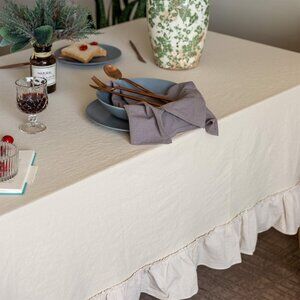 [UNIQUE DESIGN]: Solid neutral off-white color and a certain extent like beige. It is natral and gentle retro color, distressed vintage style, minimalist desktop with beautiful beige Flounces Trim, slight natural wrinkle on the washed cotton fabric, which make this table cloth vintage and elegant. This table cover will make your meal time more luxurious. suitable for outdoor, patio, gardens, kitchen room, dining room, family room and decoration.