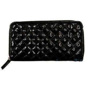 Gloss Black Diamond Stitch Zipper Wallet. 12 card slots with a zipper pocket in the middle and 2 cash slots. Zipper has a vinyl pull.