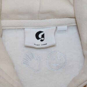 Soft off-white hoodie with front pocket. Features pink logo patch and subtle branding.