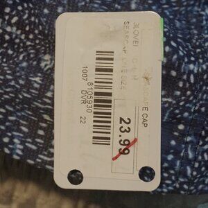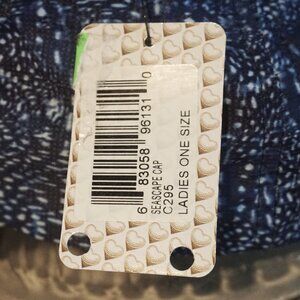 Glove It Hat. Navy Seascape Cape. Abstract Blue and Navy Print top with Navy Bill. Lightweight Top. Adjustable Velcro Closure. 100% Polyester. Women’s One Size Fits Most. New with Tags.