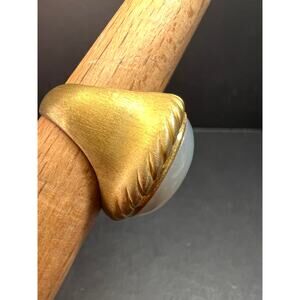 Glow By Sheila Fajl Signed 18k yellow brushed gold plate with a blue agate / chalcedony stone. Size 7. Made in Thailand.