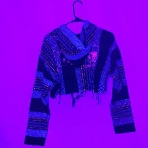 Upcycled drug rug. Blacklight reactive, Custom VHS inspired design, and distressed crop