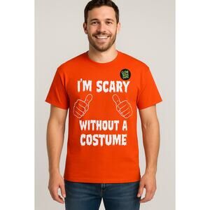 Brand new with tags! This bright orange Jerzees HiDensi-T glow-in-the-dark Halloween shirt is a fun alternative to a costume. Featuring bold thumbs-up graphics and the playful phrase “I’m Scary Without a Costume,” it’s a guaranteed conversation starter. Made of 100% cotton, soft and comfortable, perfect for Halloween parties, trick-or-treating, or casual wear. Adult unisex Medium.