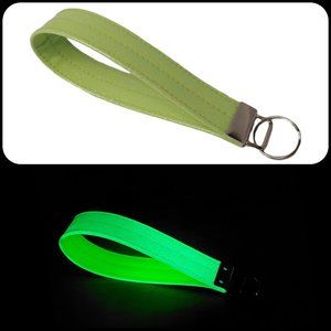 These key lanyard/wristlet strap measure between 6"-6.5" long with the hardware. The raw edges are finished with a glow-in-the-dark paint and covered in a clear coat.