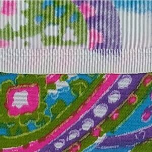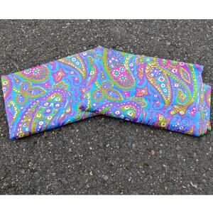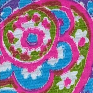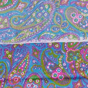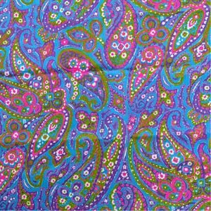 Neon bright silky smooth acetate (? - could be poly, not stretchy) fabric vintage 1960's or 1970's. Pattern is of iconic retro paisleys full of flowers. The fabric has swirls & twirls galore just glowing with teal purple lime & fuchsia pink. No maker's mark. In excellent vintage condition; some storage fold marks & there's a piece of tape on one corner as shown that I've not tried to remove (last pic).