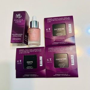 This bundle includes 3 highlighter by Makeup Geek and a SKIN elixir (rose quartz) a luminous finish liquid primer by Makeup Geek. Highlighter includes