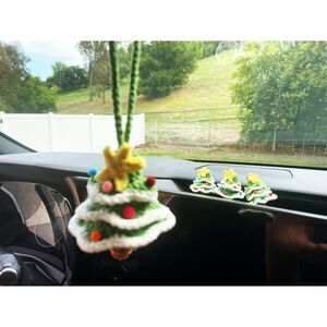 Glow-in-the-Dark Christmas Tree Car Charm (Single) .A kawaii amigurumi charm for your rearview mirror or holiday décor. Charges under light and gives off a cozy green glow on night drives. 🎄🌟