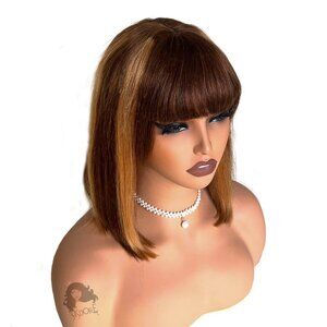 This 3x1 lace, glueless bob wig with bangs comes in 3 stunning colors: #1B natural black, 99j burgundy, and #4/27 brown with blonde highlights. Made with top-quality human hair, it provides a flat, tassel-like finish for a stylish and effortless look. It doesn't need any glue, you can wear and go in minutes, the 3x1 lace will makes the parting area looks super natural! Perfect for black women seeking a short and chic hairstyle at low prices.