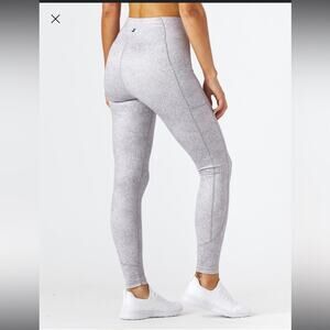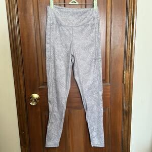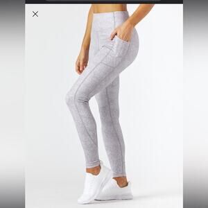 High waist fit and has side pockets (on each leg). Feels like cotton like and is fade resistant. The wording peeled off but the material is 70% polyester and 30% Spandex. Machine wash cold with like colors. Aside from that, this is in great used condition, no flaws or damage to note.