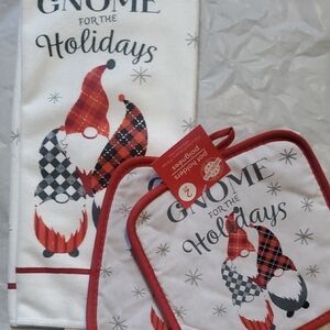 "Gnome For The Holidays" Festive kitchen set featuring gnome designs. Includes a towel and 2 pot holders. Towel is white. Pot holders background is gray. Perfect for holiday decor.